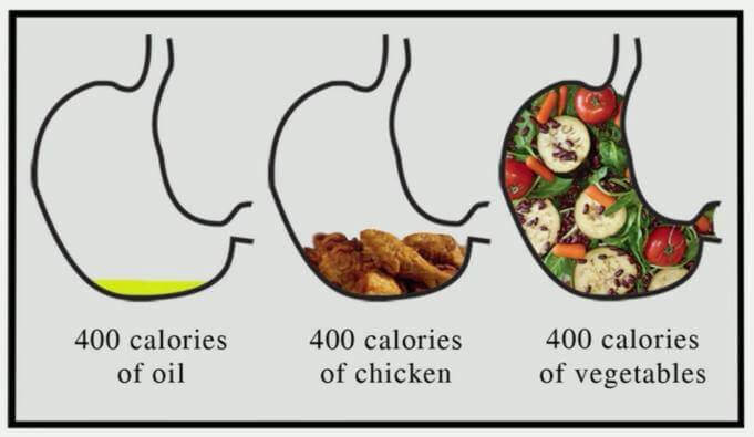 Vegetables take up a lot of space but they’re very low in calories. Fats like coconut oil or olive oil take up very little space but are very calorie-dense.