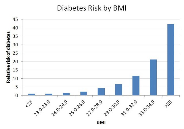 People who were on the cusp of obesity (BMI of 30) are over 6 times more likely to develop diabetes. Of course, genes, stress, inflammation, sleep quality and activity levels play a role as well.