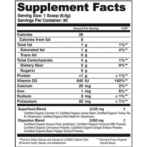 There are two sets of ingredients in Organifi Green Juice. An “alkaline greens blend” and a “superfood” blend.
