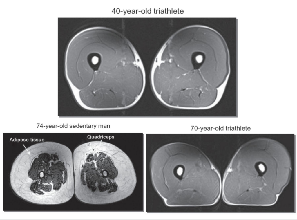 It shows the leg muscles of a 40-year-old triathlete, a 74-year-old sedentary man, and a 70-year-old triathlete.