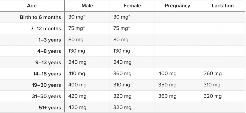 The table below shows the recommended daily allowance (RDA) or adequate intake (AI) for men and women in the United States